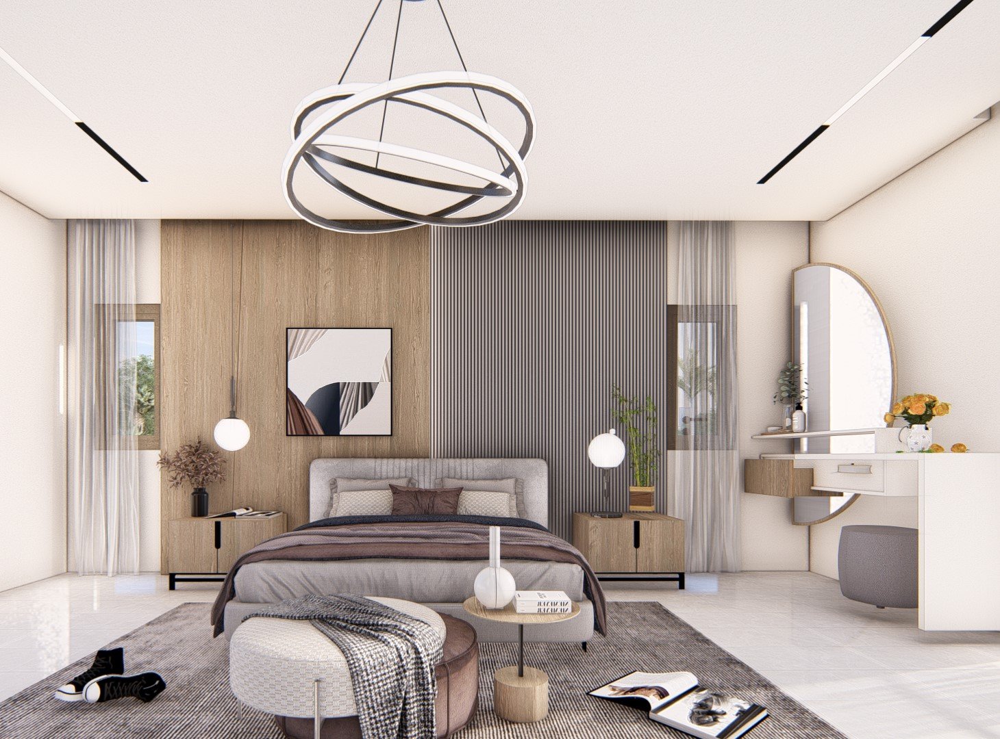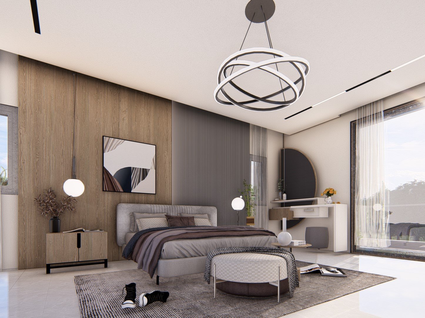 Le mur en tête de lit, mêlant bois et panneaux