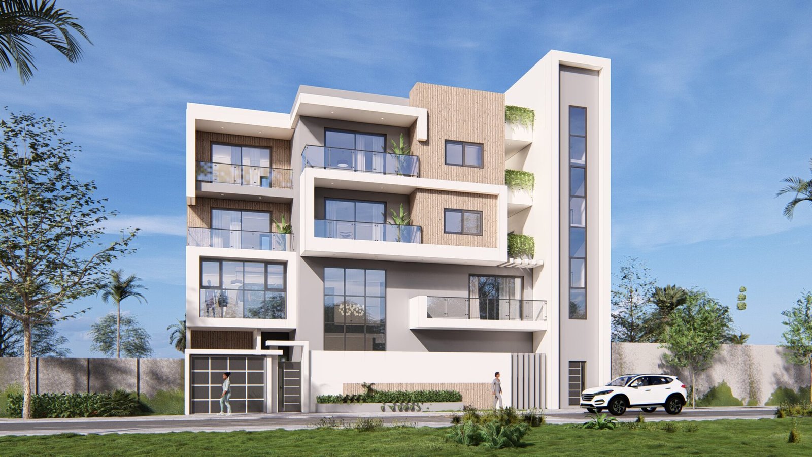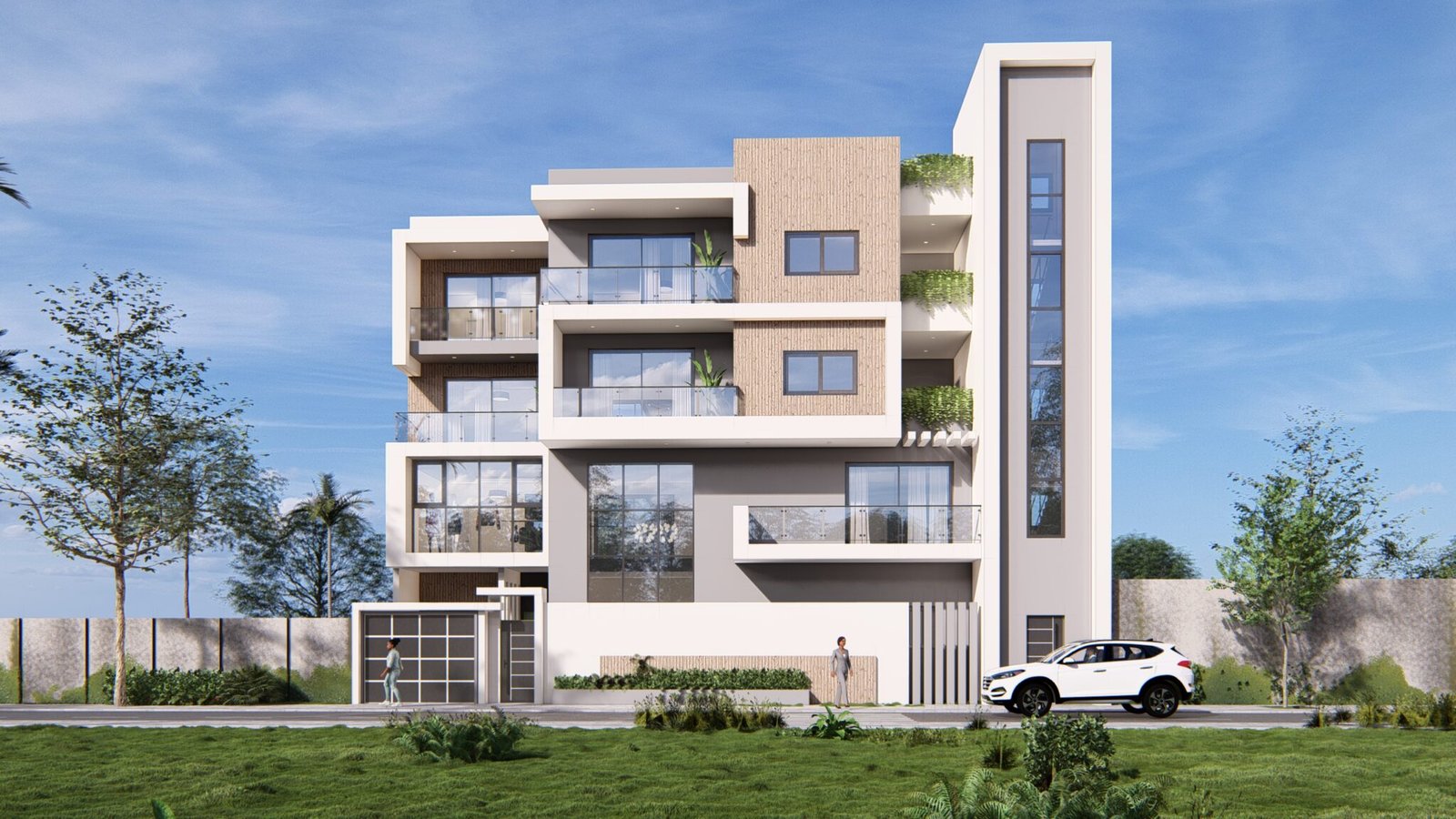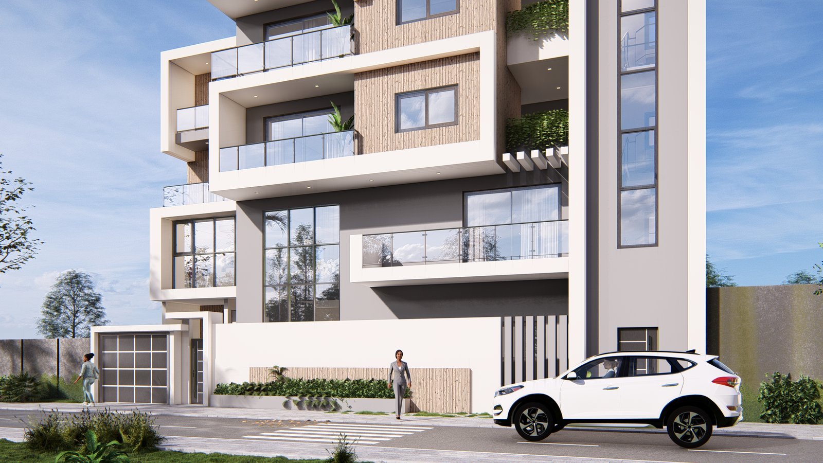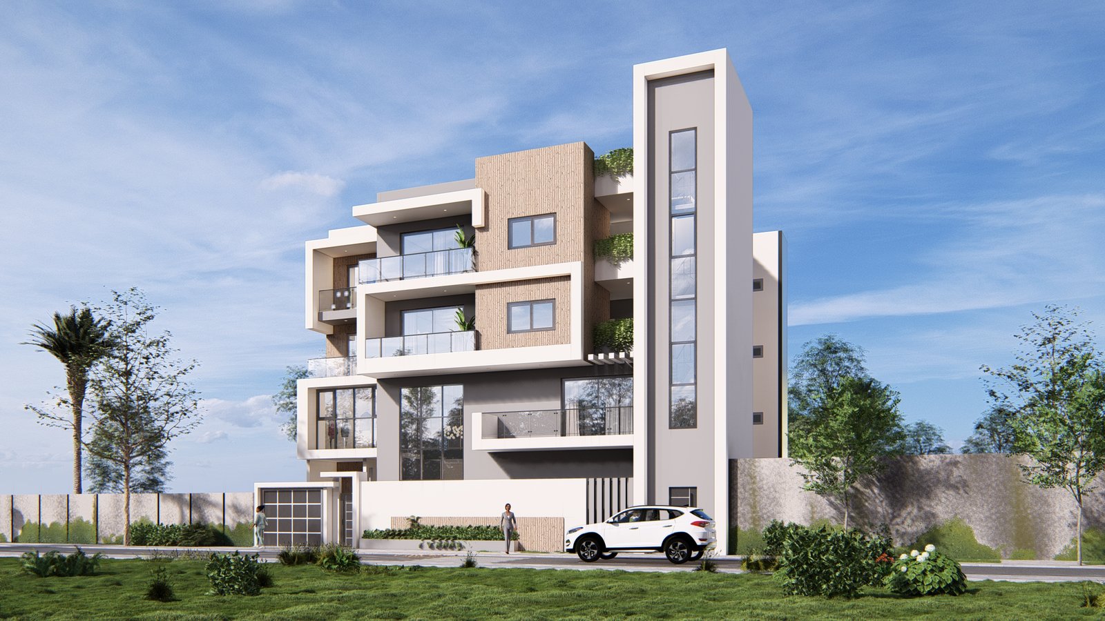 Ce projet d’immeuble résidentiel se compose d’un duplex de cinq chambres avec salon et cuisine, complété par deux appartements au dernier niveau.